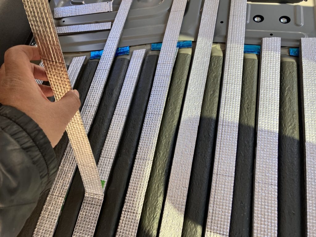 - 断熱シートの施工:Quiet-Moを広げて、上から重ねるように配置。端はアルミテープでしっかりと固定し、ズレやすい場所も補強します。