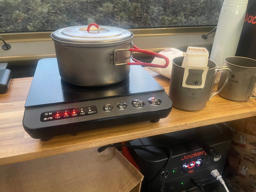 IHコンロは、使用するポータブル電源の出力(例:定格1000W)を超えないものを選ぶ必要があります。私が選んだコンロは、レビューで「ファン音が静か」「車内でも安心して使える」とあり、サイズも大きすぎず小さすぎずでちょうど良いものでした。小型すぎると、鍋がスイッチに干渉してしまい、やけどのリスクがあるというレビューもあったため、サイズ選びはとても重要です。